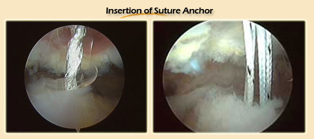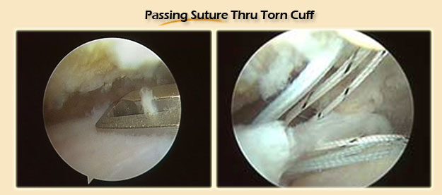 Next the tendon tears are reattached to the humeral head tendon footprint using absorbable suture anchors.