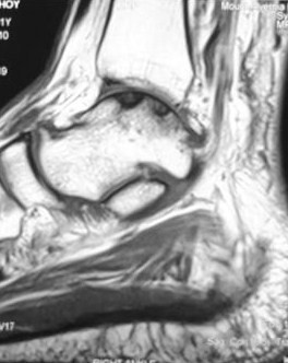MRI scan showed an osteochondral lesion involving the superomedial aspect of the talar dome.