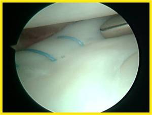 This meniscus tear was repaired using an inside-out meniscus repair technique as shown: