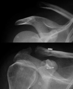 The x-rays will show a separation of the acromio-clavicular joint.  This is sometimes termed “shoulder separation” as opposed to “shoulder dislocation”.