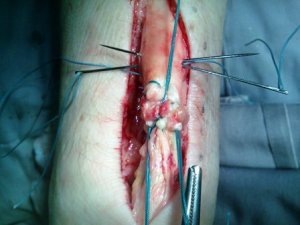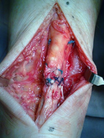 Surgery involves a 3 to 5cm incision over the back of the ankle centred over the torn tendon.