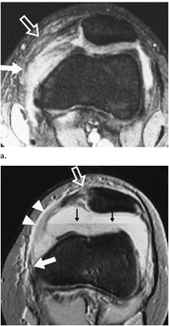 This is an example of a scan showing ruptured medial patellofemoral ligament after an acute lateral patellar dislocation: