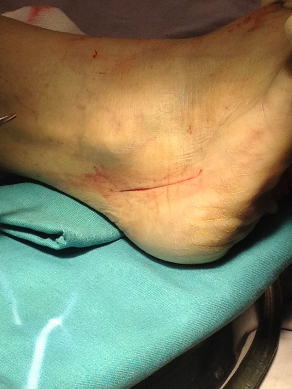 An incision is made on the outer aspect of the heel to expose the heel bone for the medial displacement calcaneal osteotomy.