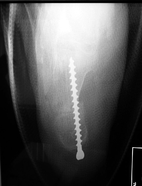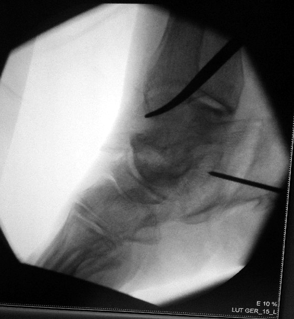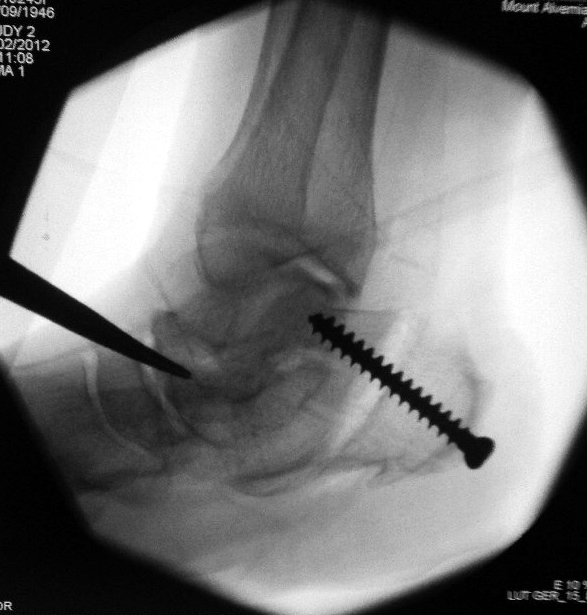 Fluoroscopy in the operating room shows correct placement of a single fixation screw into the heel bone.
