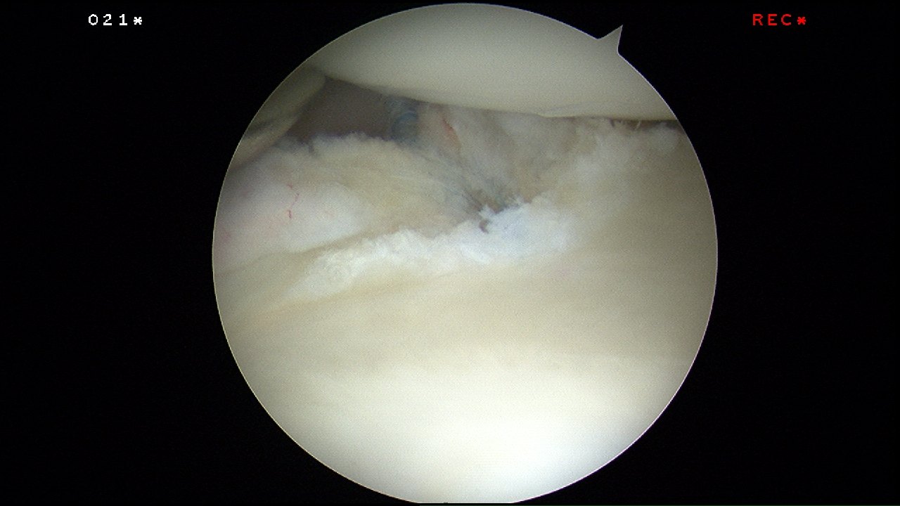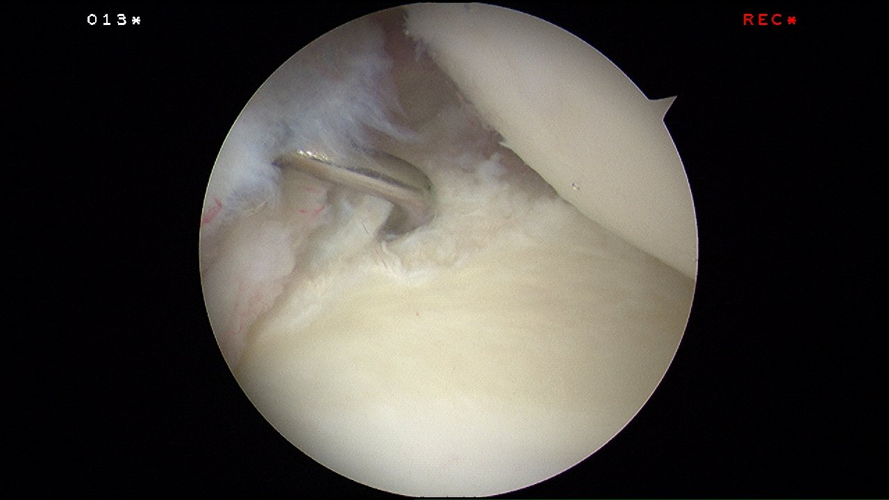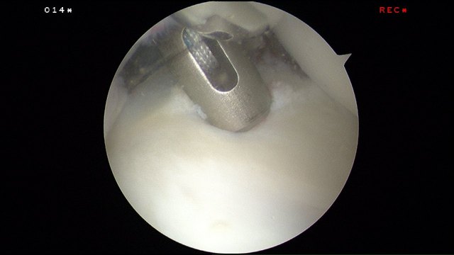 A pilot hole is drilled for the passage of the suture anchor. This drill is inserted through the posterior shoulder portal with the camera in the antero-superior portal.