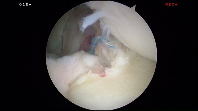 The sutures are passed around the labral tear using a shuttle suture (blue).