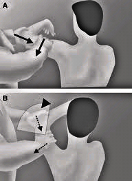 A – With the patient in a sitting position with the arm 90 degrees of abduction, the examiner holds the elbow and lateral aspect of the proximal arm, and a strong axial loading force is applied.
