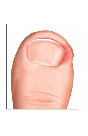 - Swelling at the base of the nail on the side of the ingrown toenail