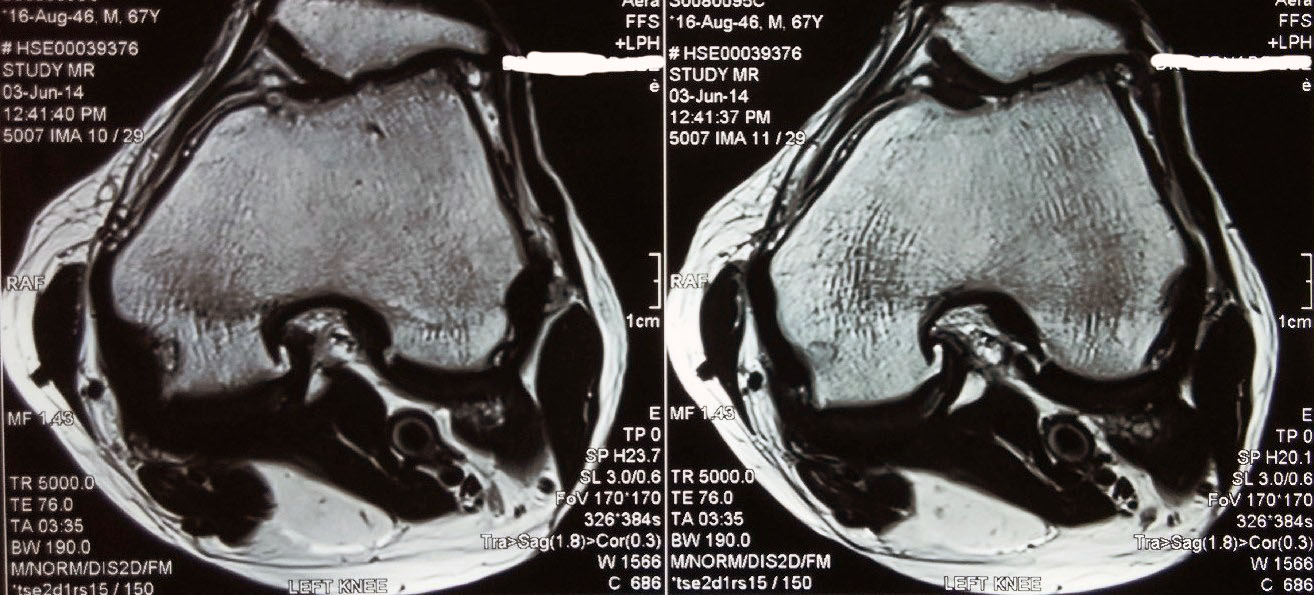 An MRI scan of his left knee showed a root tear of the posterior horn of his medial meniscus with loss of hoop stress, extrusion of the medial meniscus together with subchondral oedema of the medial tibial-femoral compartment and thinning of the cartilage of the medial compartment of his left knee.