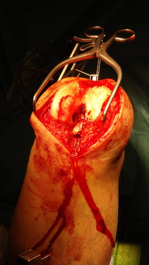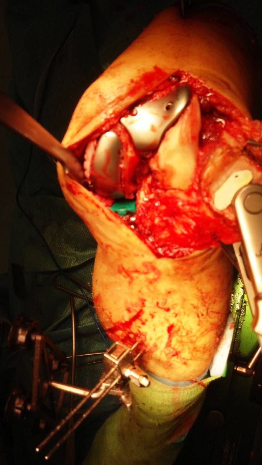 A standand midline incision and medial parapatellar approach was used. The osteoarthritis was confirmed to be mainly affecting the medial and patellofemoral compartments of his left knee.