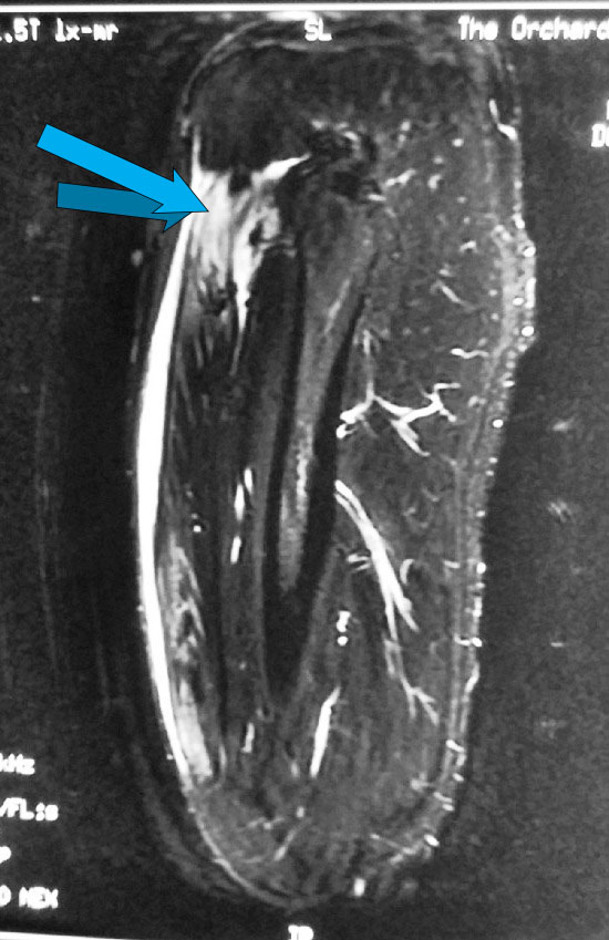 An MRI scan of his right thigh was ordered. The MRI confirmed a tear of the direct head of the right rectus femoris.