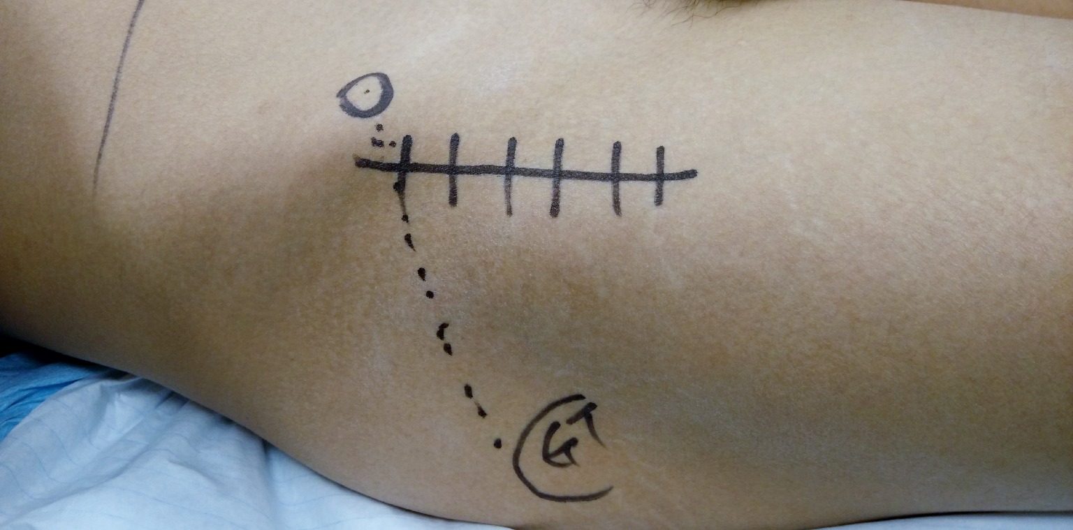 A 6 to 8cm longitudinal incision was made just lateral to the anterior superior iliac spine (ASIS) and moving distally.