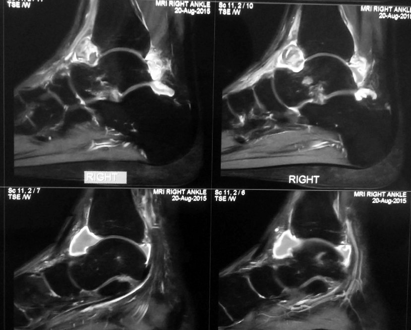 An MRI scan of his right ankle was done and it showed an intra-articular nodule / tumour over the front of his right ankle. It was consistent with a pigmented villonodular synovitis (PVNS).