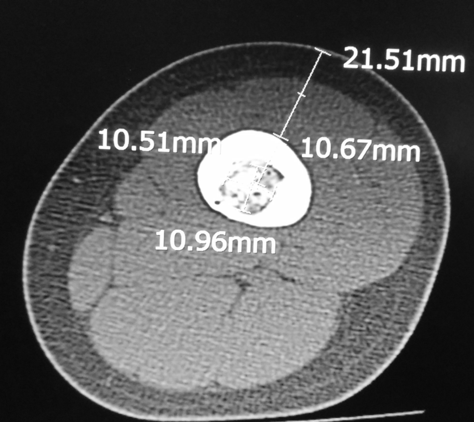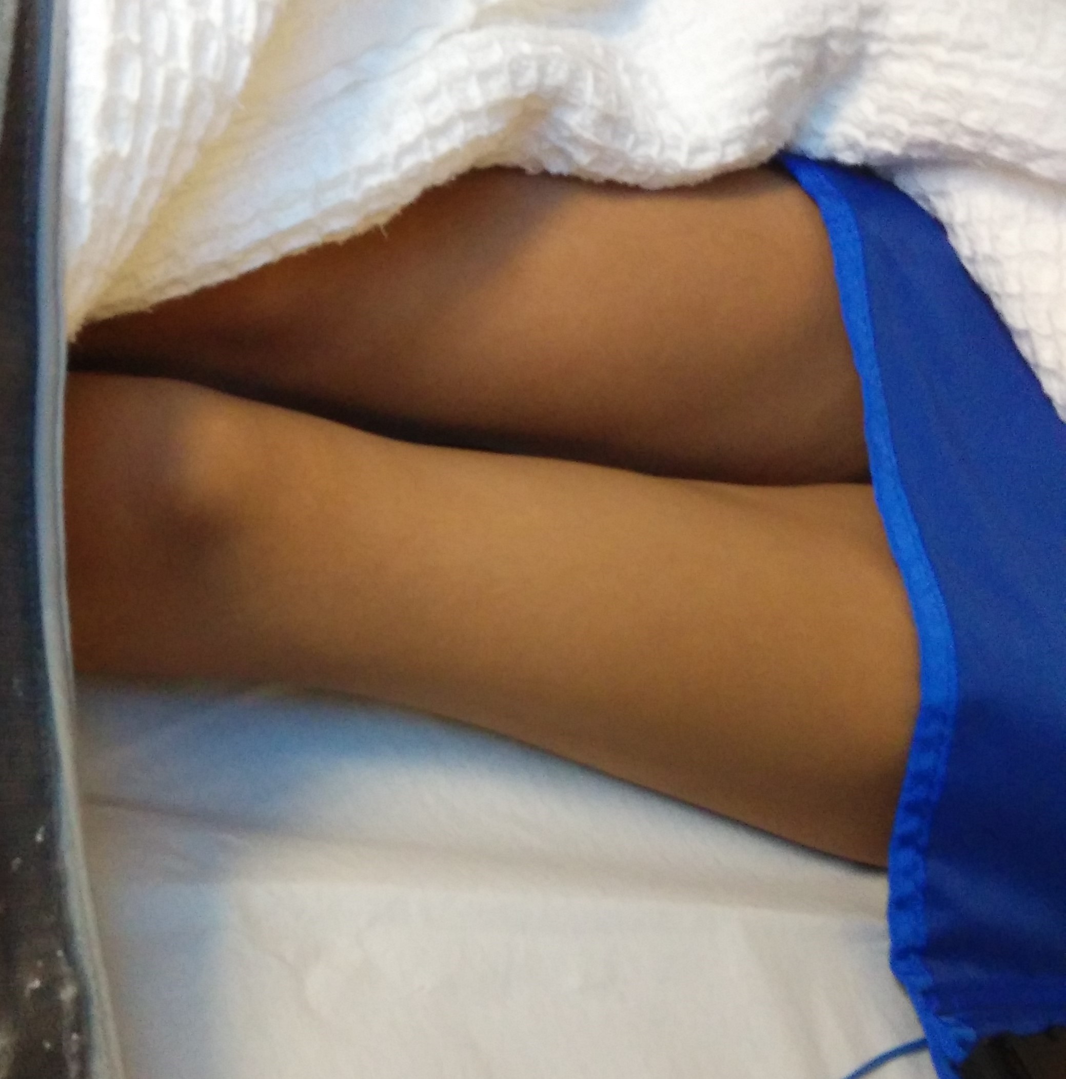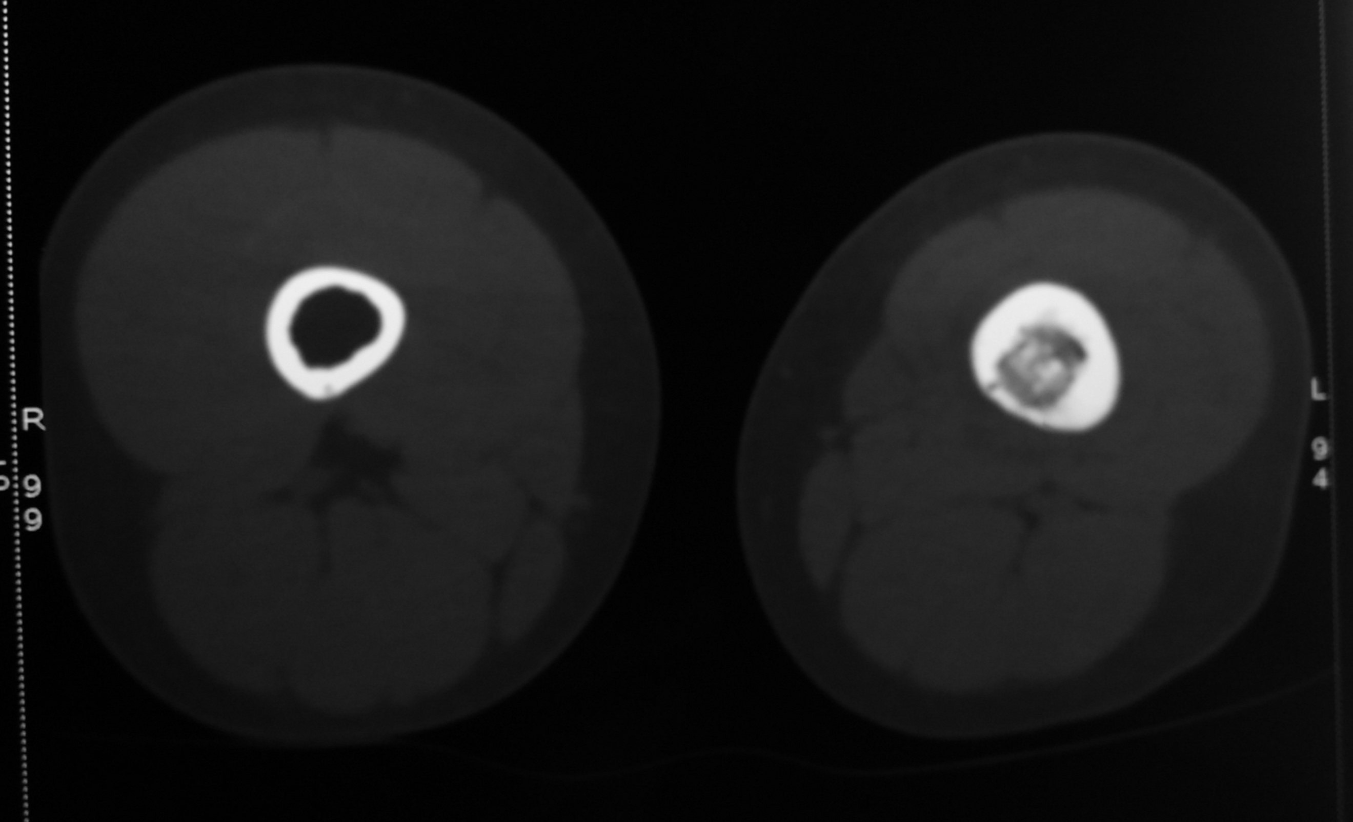 The CT-scan also showed muscle atrophy of the left thigh muscles compared to the right thigh.