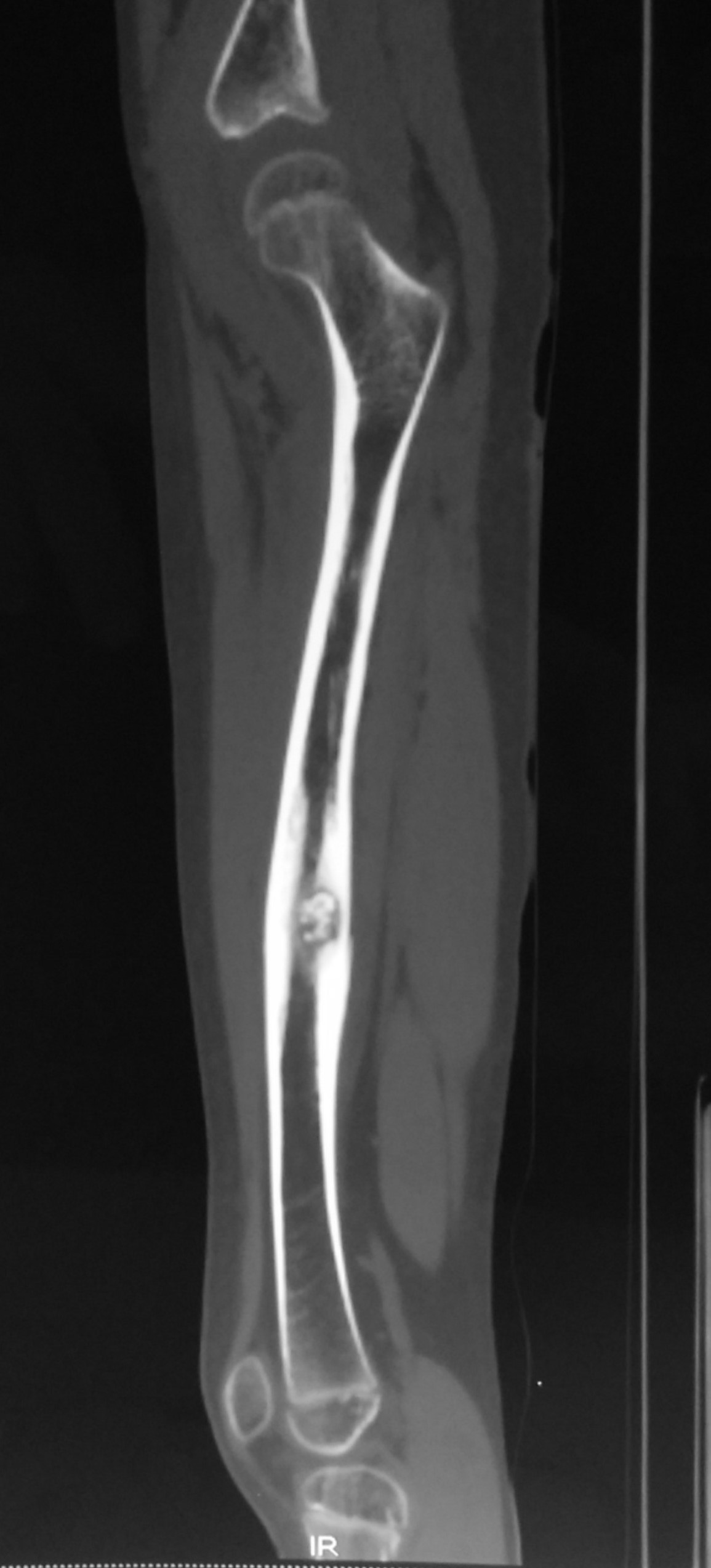 CT-scan was done to further evaluate the lesion. It confirmed the diagnosis based on the typical features.
