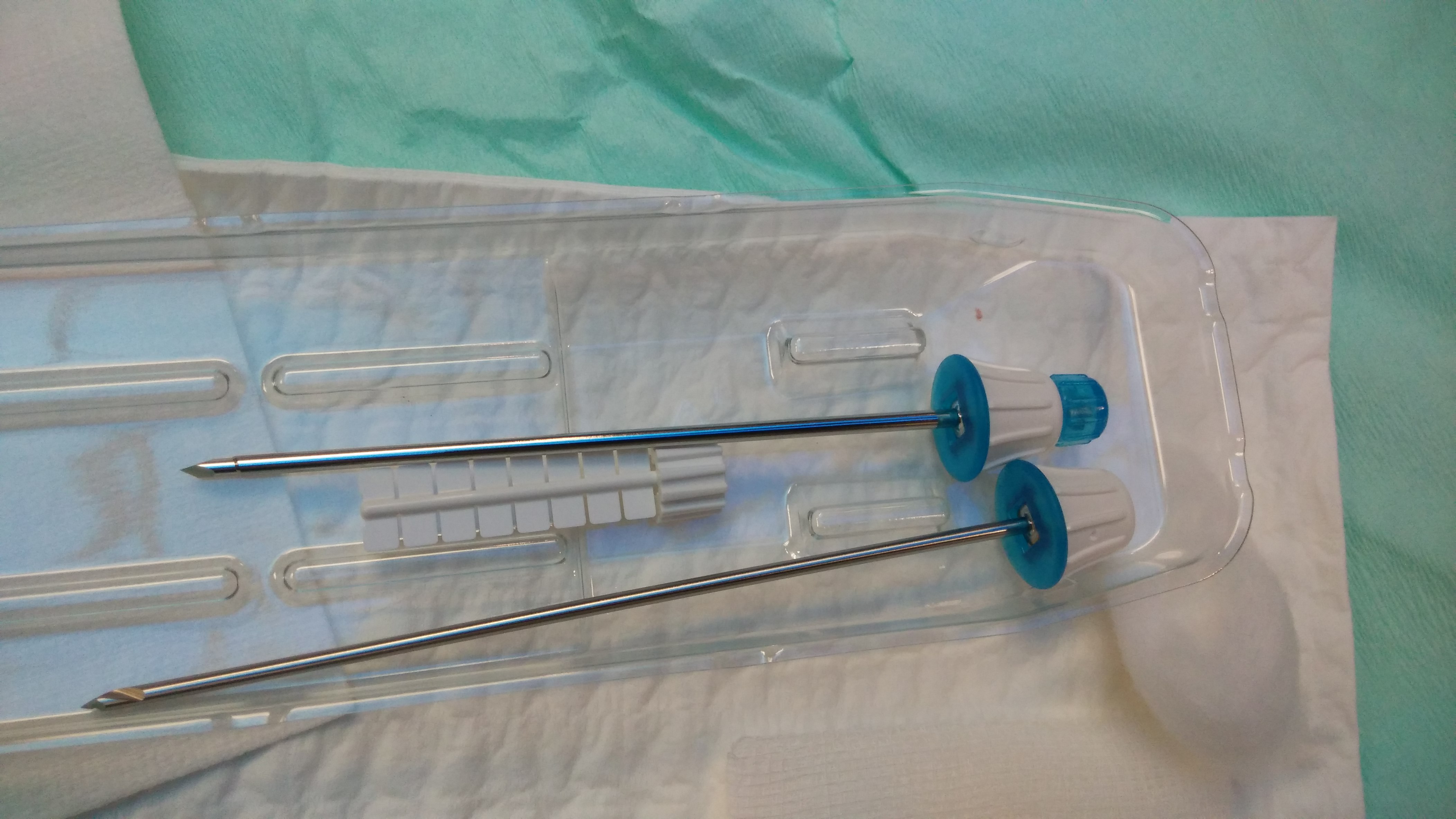 A bone trephine (sharp metal awl) is used to create a channel in the femur cortex to allow the radiofrequency probe to enter the femur bone and into the osteoid osteoma.