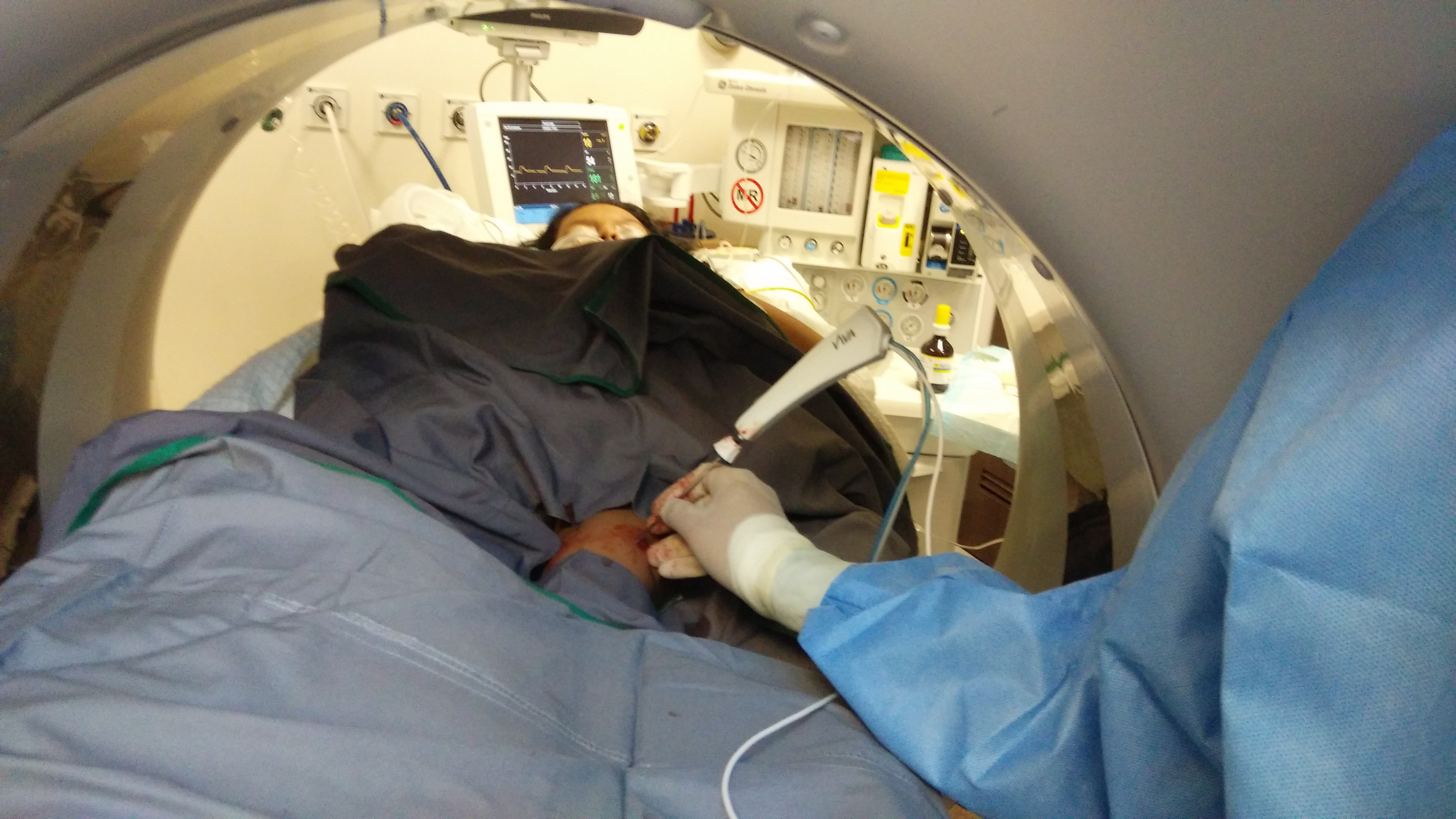 Under CT-scan guidance, a needle is inserted from the front of the thigh to inject contrast fluid to hydro-dissect the tissues at risk from the zone of heat injury.
